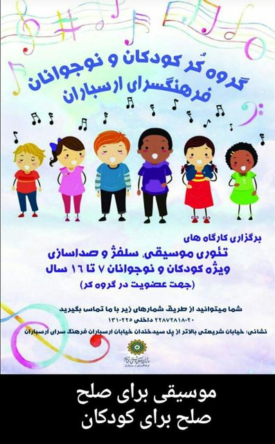 فرهنگسرای ارسباران برای تشکیل گروه کر و اجرای کنسرت با هنرمندی کودکان و نوجوانان برای نخستینبار با برگزاری کارگاه آموزشی «موسیقی برای صلح و صلح برای کودکان» عضو میپذیرد.